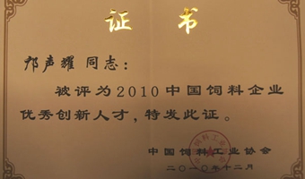 中國飼料工業(yè)協(xié)會(huì)授予四川省畜科公司董事長鄺聲耀研究員“2010中國飼料企業(yè)優(yōu)秀創(chuàng)新人才獎(jiǎng)”。